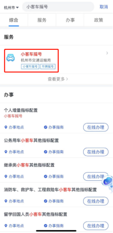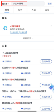 第二步:在首页搜索框输入“小客车摇号”,并将定位选择为“杭州市”