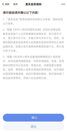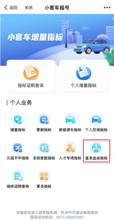 温馨提示:转让方和受让方均可通过“浙里办”APP--“小客车摇号”--“指标证明查询”--“其他指标”查看或打印“直系血亲”指标证明文件;受让方使用证件类型非“居民身份证”的,请通过“浙江政务服务网”--“个人小客车指标综合服务”打印指标证明文件,同时也可至线下调控窗口打印指标证明文件