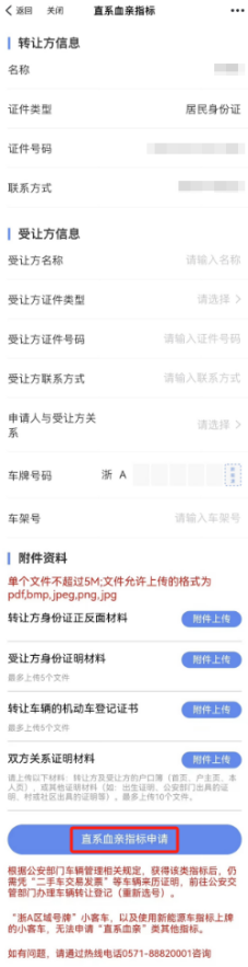 第六步:请先核对转让方信息,再填写受让方信息,并上传附件资料后,点击“直系血亲指标申请”