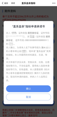 第七步:请仔细阅读“‘直系血亲’指标申请承诺书”并确认信息后,再点击“确认”,需返回上一页面的可点击“取消”