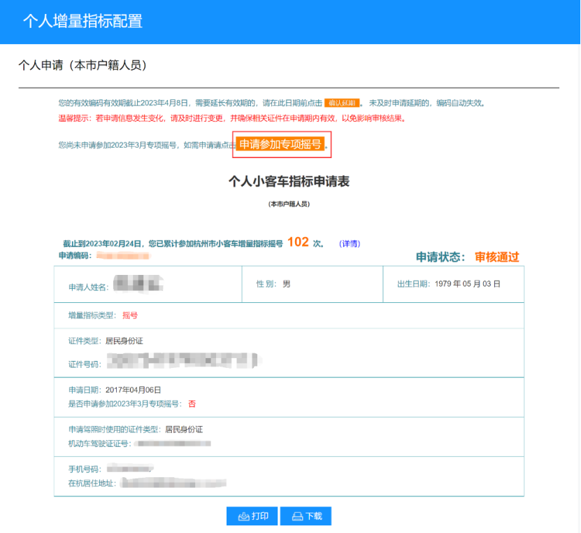第七步:若成功报名专项摇号,“申请表”中“是否申请参加2023年3月专项摇号”将显示为“是”