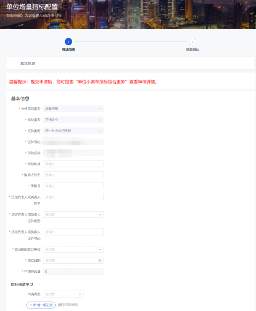 第五步:填写相关的申请信息,确认无误后提交即可(注意:请选择是否申请区域指标、增量指标及增量指标类型)