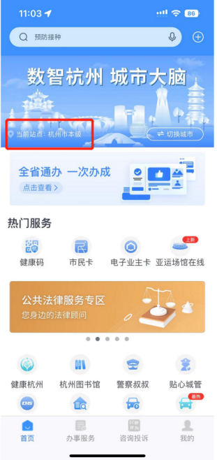 第一步:打开手机APP“浙里办”,首页将定位选择为“杭州市本级”