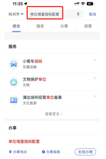 第二步:在首页搜索框输入“小客车摇号”,并将定位选择为“杭州市”