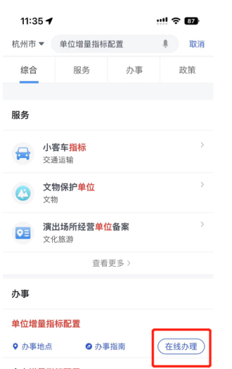 第三步:点击“办事”目录下的“单位增量指标配置”——“在线办理”