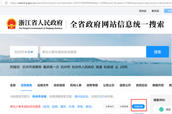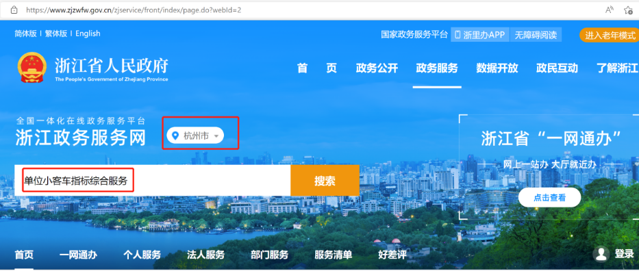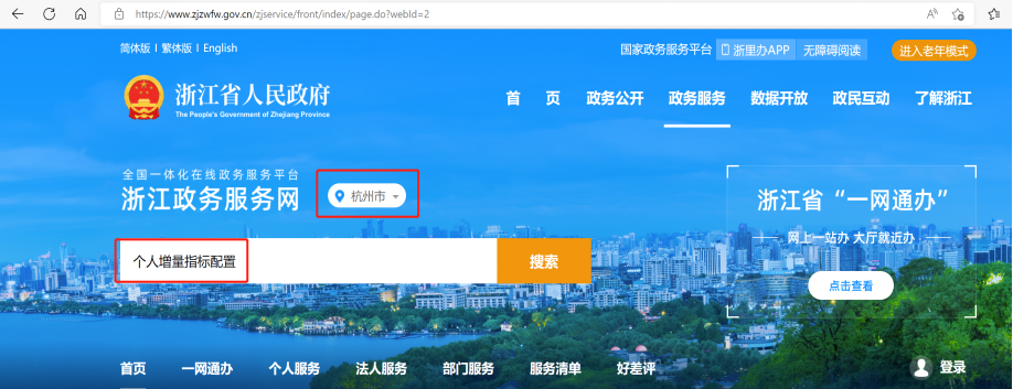),首页将定位选择为“杭州市”,并在首页的搜索框内直接输入“个人增量指标配置”/“单位小客车指标综合服务”