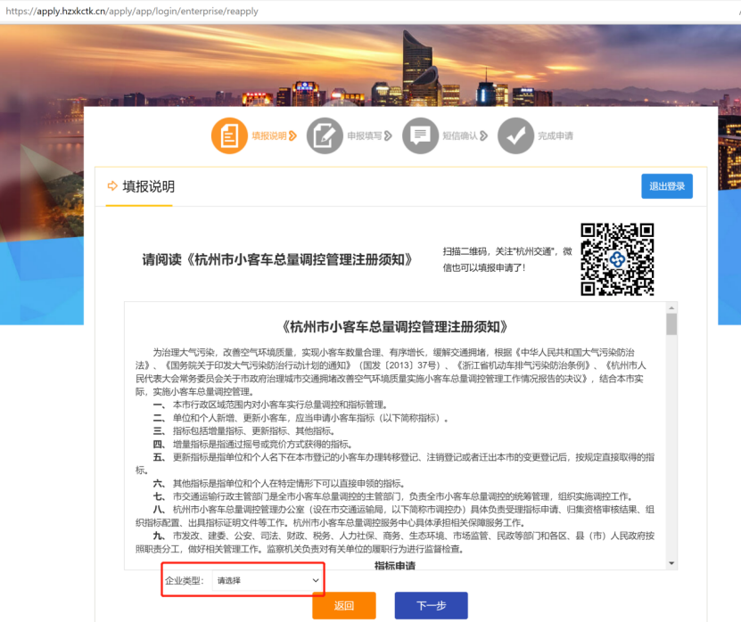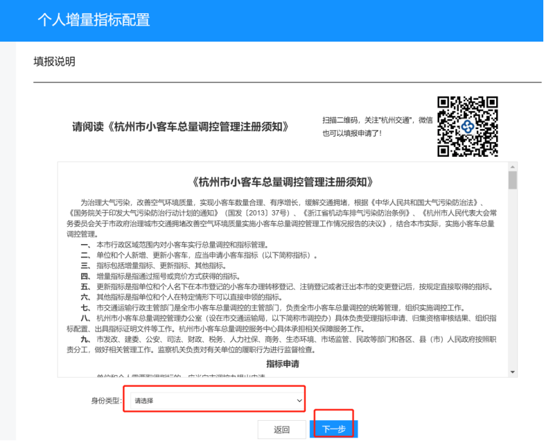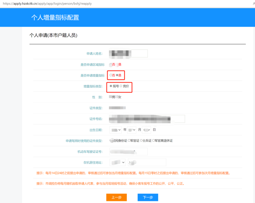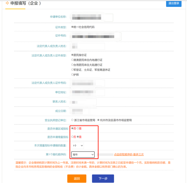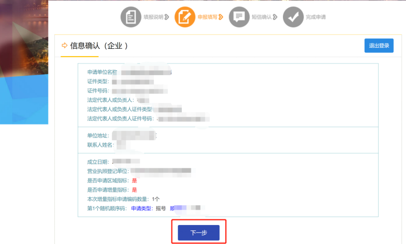 第十一步:填写申请信息,“是否申请增量指标”选择“是”,并选择要申请的增量指标类型,点击“下一步”