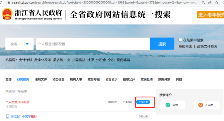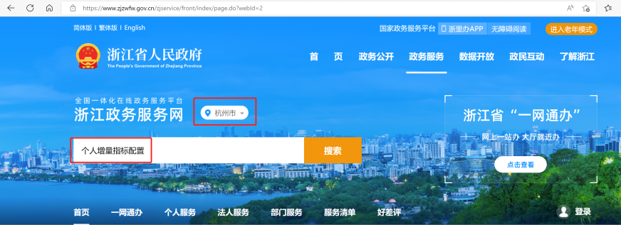 ),首页将定位选择为“杭州市”,并在首页的搜索框内直接输入“个人增量指标配置”