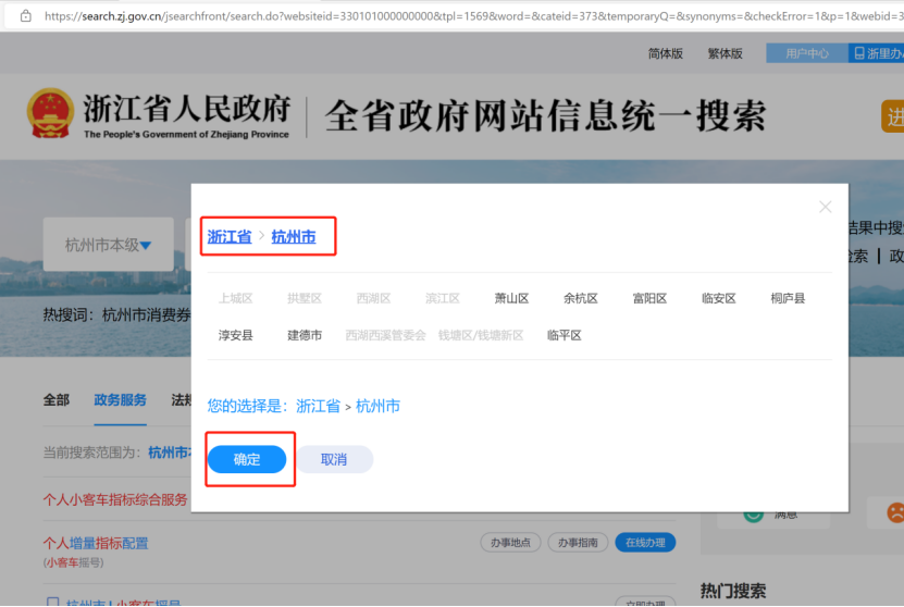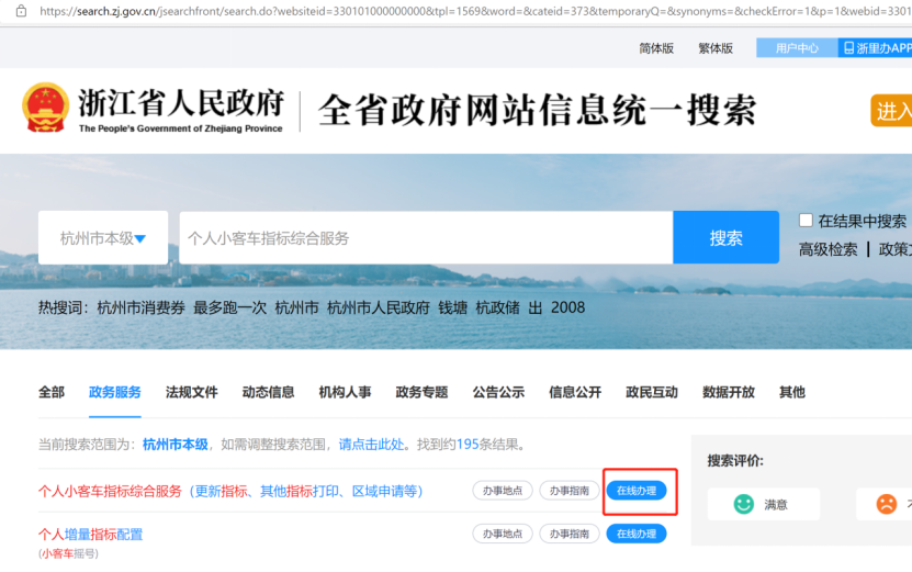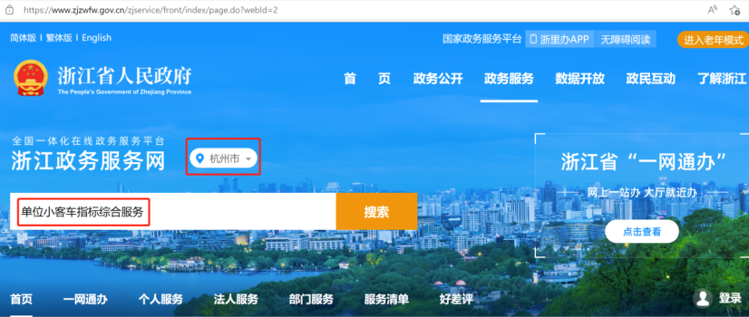 ),首页将定位选择为“杭州市”,并在首页的搜索框内直接输入“个人小客车指标综合服务”