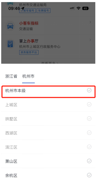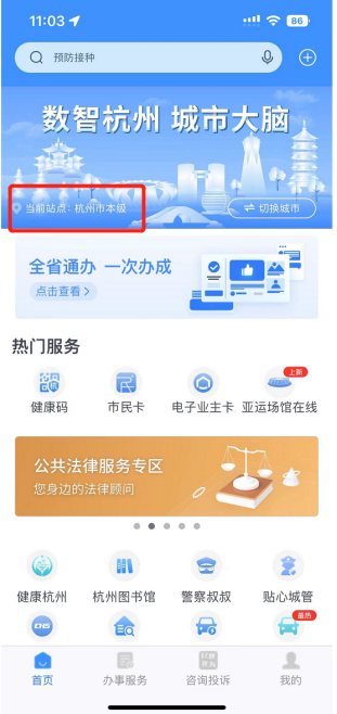 APP“浙里办”,首页将定位选择为“杭州市本级”