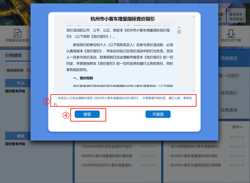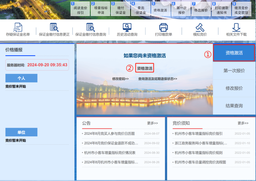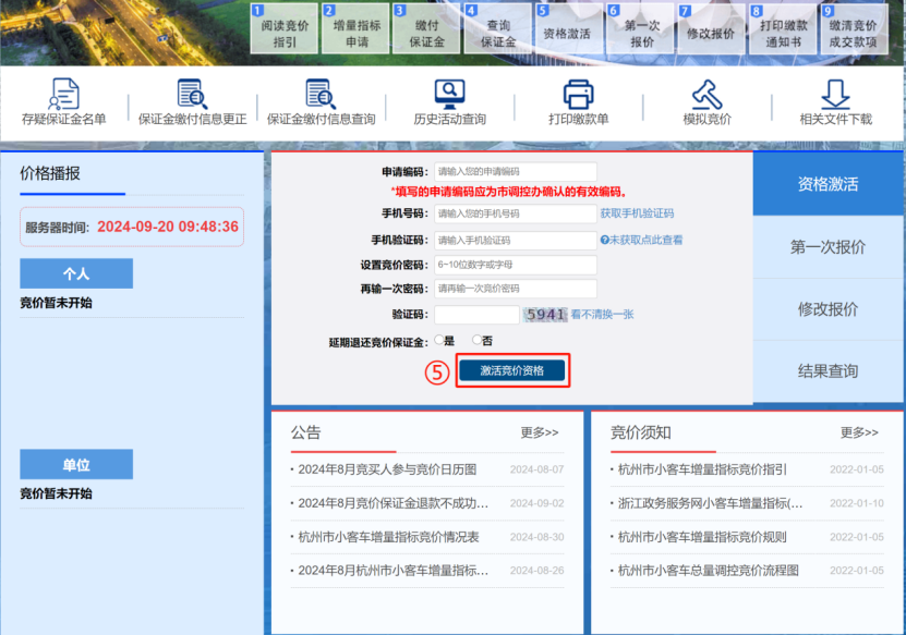 符合资格的竞买人凭已确认为有效编码的申请编码及报名时填写的手机号码,在竞价官网(www.hzqcjj.com)按照以下图片步骤进行竞价资格激活(个人仍可通过支付宝生活号进行资格激活),在资格激活时须选择是否延期退还竞价保证金(具体时间以每期增量指标竞价公告为准)。